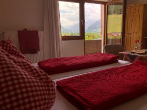 Behaaglijke tweepersoonskamer (16 m2) op de eerst verdieping. Prachtig uitzicht op de bergen. Bedden zijn opgemaakt en de handdoeken hangen klaar.